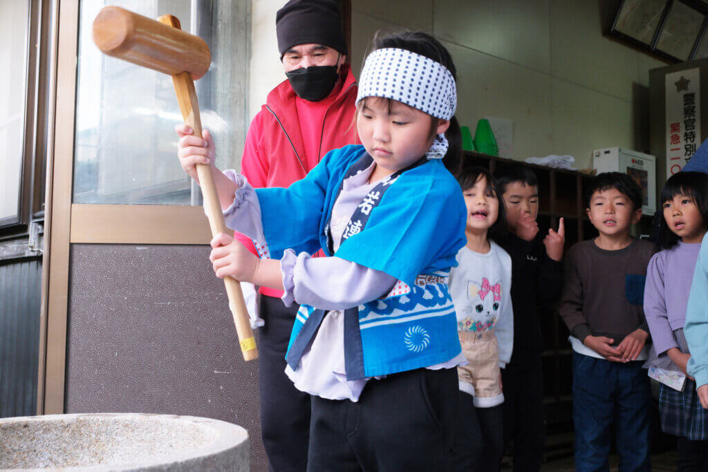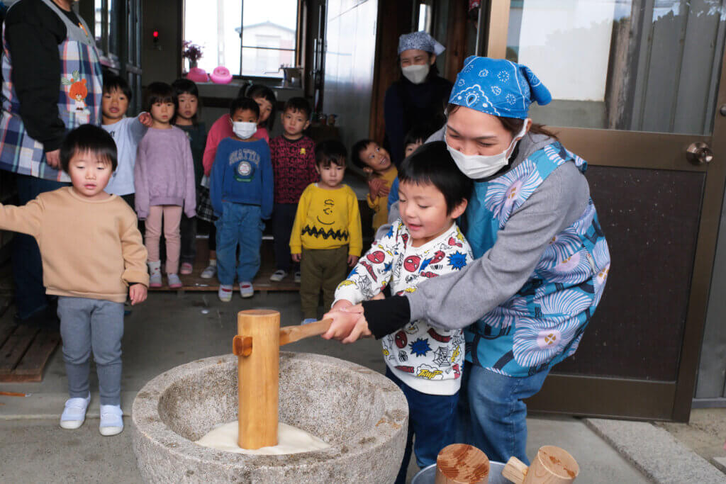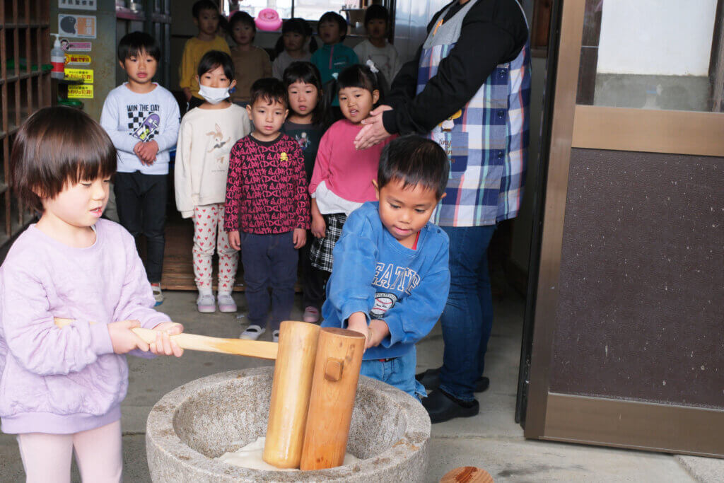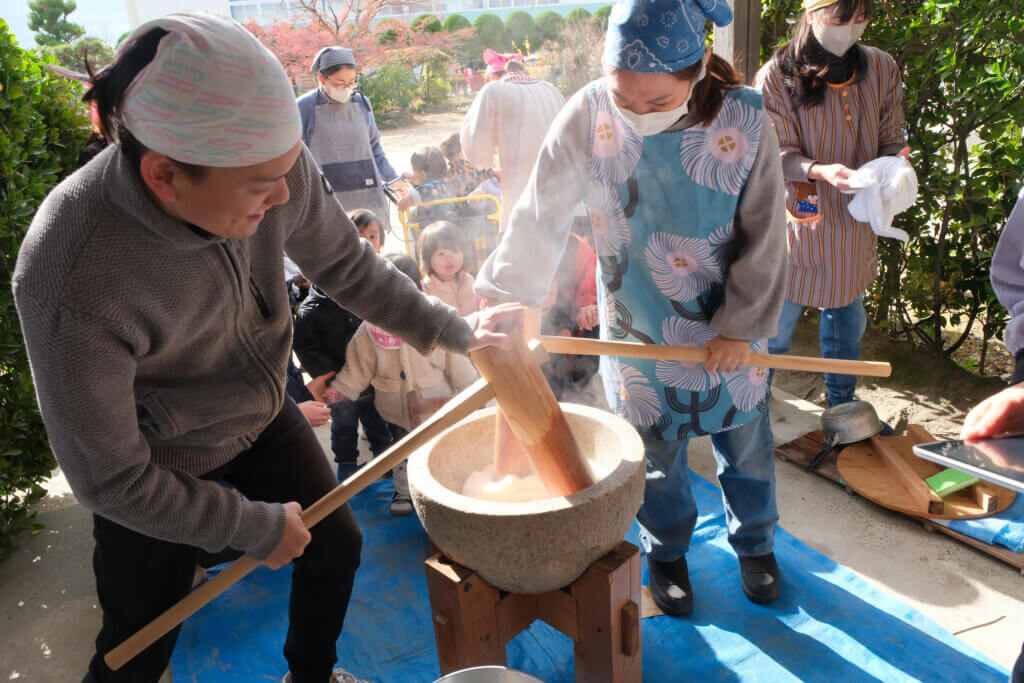 もちつき(12月5日) 投稿日 2026年2月3日 著者 hirumahoikuen カテゴリー 行事 日本ならではの伝統行事、もちつき。12月5日にもちつきを行いました。 ほかほかに蒸したもち米を、石臼に入れて小突き、いよいよ餅つきの始まり。 杵を持ってぺったんぺったん。「よいしょ~!」の掛け声に気合も十分です。 みんなで一生懸命ついたおもちは、給食でいただきました。あんこもちにきなこもち。「おいし~」「やわらかいね~」とみんなモリモリ食べて満足そうでした。