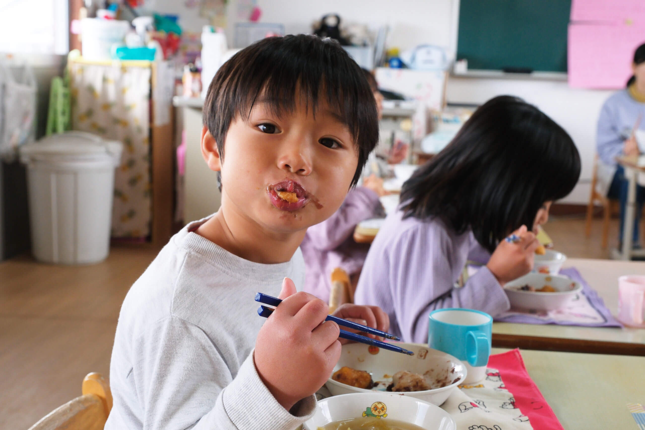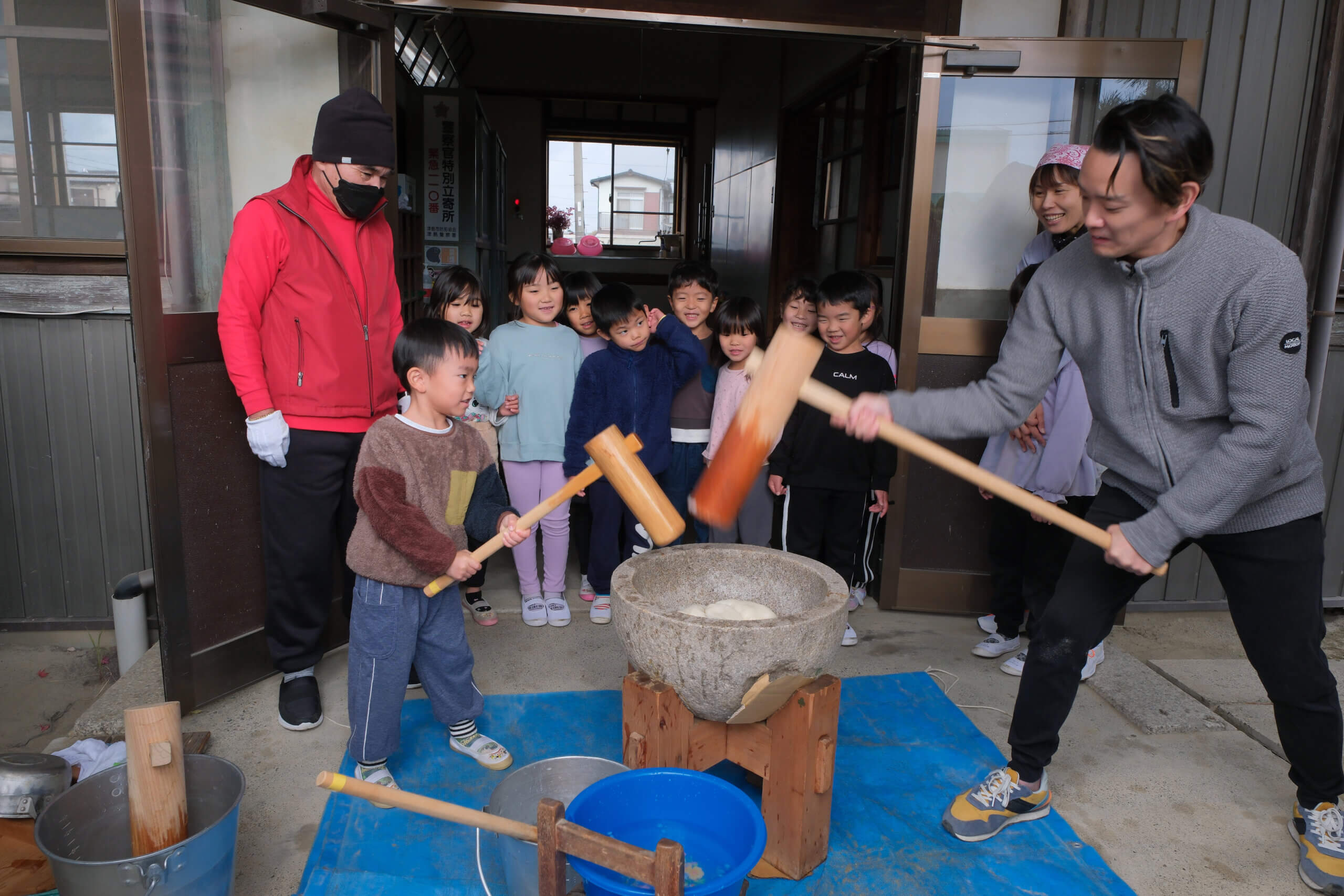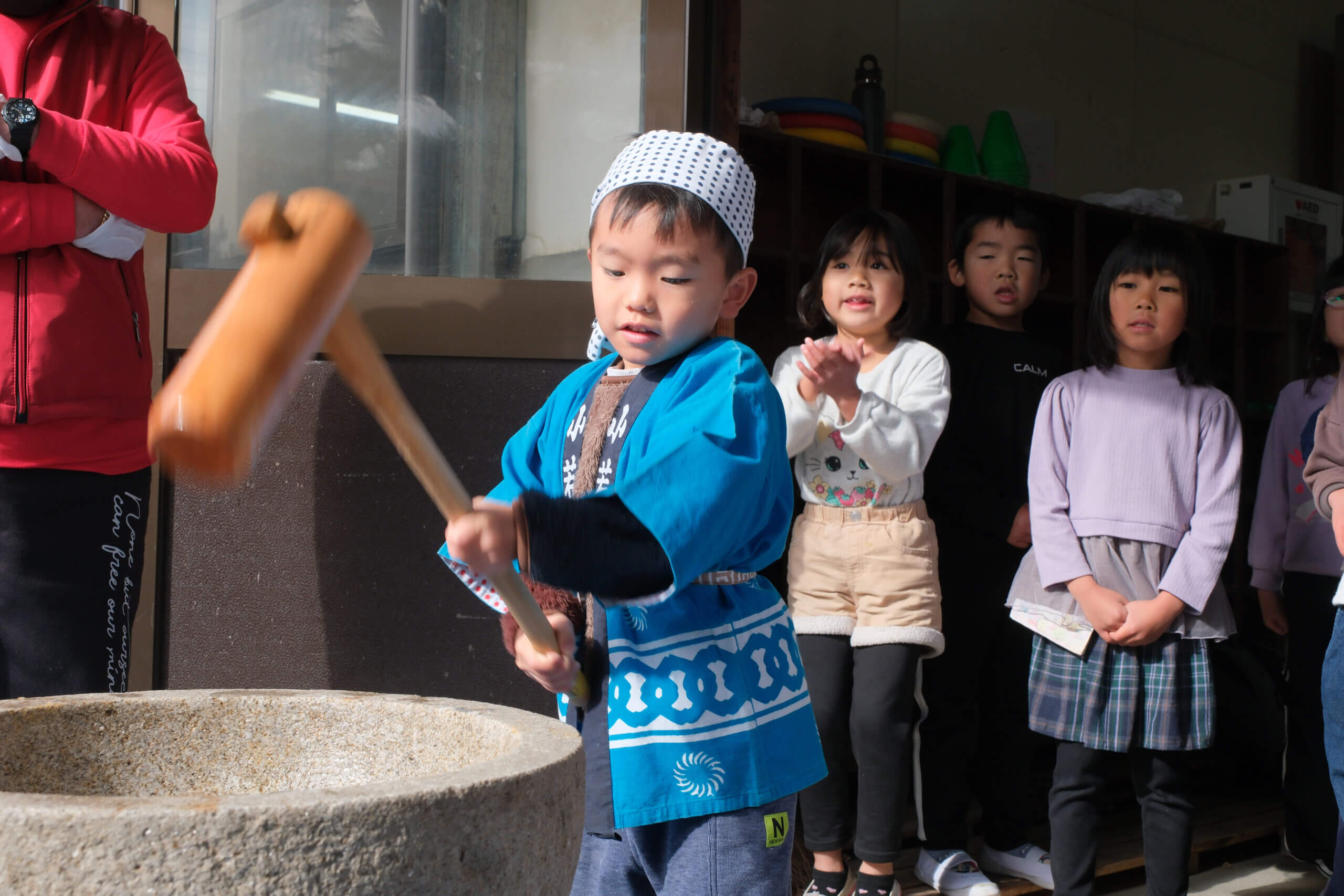 もちつき(12月5日) 投稿日 2026年2月3日 著者 hirumahoikuen カテゴリー 行事 日本ならではの伝統行事、もちつき。12月5日にもちつきを行いました。 ほかほかに蒸したもち米を、石臼に入れて小突き、いよいよ餅つきの始まり。 杵を持ってぺったんぺったん。「よいしょ~!」の掛け声に気合も十分です。 みんなで一生懸命ついたおもちは、給食でいただきました。あんこもちにきなこもち。「おいし~」「やわらかいね~」とみんなモリモリ食べて満足そうでした。